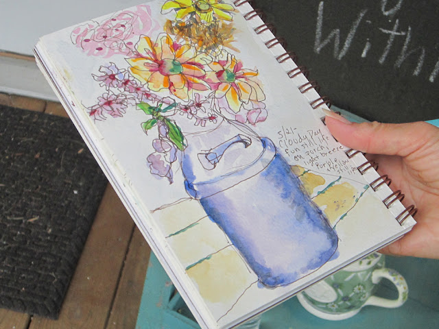 This morning started out wet and rain threatened as I arrived at the lovely Lavender Fields in Milton, Delaware for session #3 of my 6-week Watercolor Journaling Workshop. MaryAnn, who works there and is also a participant in the class, and I decided that since it looked like the heavens were about to open up, to have the class meet in the gift shop instead of the tea room/classroom. There are so many delightful lavender-oriented things for sale there that I felt there would be ample opportunity for subject matter. But, by the time everyone arrived, it seemed as if the rain was not going to come so soon and I quickly changed gears and set everyone on their way to journaling straight away!